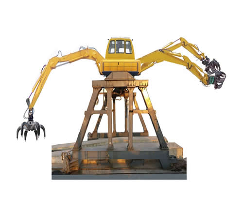 根據(jù)神華寧煤集團(tuán)凍煤卸車實際工況要求:我公司為其設(shè)計龍門軌道式三臂凍煤卸車機(jī),即在卸車機(jī)前端設(shè)計雙臂雙手配握取式振動器,握住車箱兩側(cè)箱板實施中頻振蕩,將輕微凍層及搭橋的煤炭卸下,且不損壞車體。同時在后面另設(shè)計一支單臂,配裝破冰抓手或液壓鎬,解決凍煤破冰及搭橋無法卸車問題。